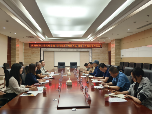 苏画代表四川省第十地质大队对刘强一行的到来表示热烈欢迎。苏画从历史沿革、发展规划、单位基本情况和科技创新等方面介绍了十大队的基本情况。他表示,学院作为地质人才的培养基地和地质科研工作的孵化器,不仅能为十大队注入源源不断的新鲜血液,还能为十大队的科技创新工作提供新的思路和方向;双方签署战略合作协议,能更好地发挥自身的人才、科研、资源和市场优势,最终实现相互促进、共同发展。