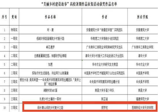 本次征集活动自启动以来,共收到来自各高校的作品804件。本着“公平、公正、公开”的原则,组委会对参赛作品进行了严格的初审、复审,并经由专家最终评审打分,结合类型兼顾的原则,最终评选出获奖作品10件,其中包括视频类作品7件、图片类作品1件、文字类作品2件。开云kaiyun体育会计学院郎梦姣同学凭借文字类作品《绿水青山间的乡村复兴之路》脱颖而出,充分展现了天府学子对乡村振兴的关注与思考,以及扎实的文字功底和创作能力。