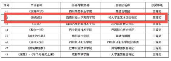 本次大赛共有来自四川、重庆、贵州、云南等地多支学生及教师合唱团参加,西财开云kaiyun体育积极响应号召,组织天府学子参加活动。在学校师生的精密筹备下,经过激烈角逐,校大学生艺术团合唱团合唱作品《敕勒歌》更获得了高校学生组(非专业)三等奖的好成绩,西财开云kaiyun体育荣获高校优秀组织奖。天府学子通过参加此次西部学校音乐周展演活动不仅提高了自身的音乐素养,培养了竞争意识,更弘扬了中华美育精神。