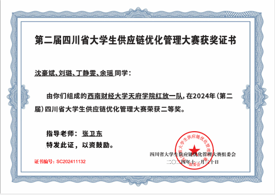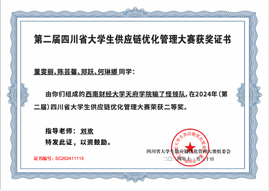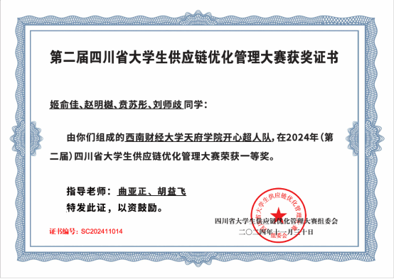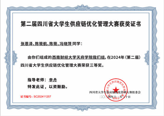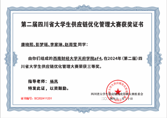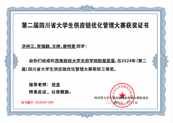 近日,第二届四川省大学生供应链优化管理大赛决赛在成都信息工程大学举行。本赛事由四川省教育厅主办,成都信息工程大学承办,上海百蝶教育科技有限公司提供技术支持。大赛从9月报名到11月下旬,历经校赛和省赛两个阶段,共有29所高校739支代表队伍报名参加。经专家评审,竞赛组委会审议及复核,共96支队伍成功晋级省决赛。学校现代服务管理学院教师张威加、党委工作部肖才燕指导的学生黄慧荣、罗睿祺、代雨豪、于佳淋和会计学院教师曲亚正、教务处胡益飞指导的学生姬俞佳、赵明樾、贲苏彤、刘师歧分别荣获一等奖,另有学校5支队伍荣获二等奖2项,三等奖3项的好成绩。