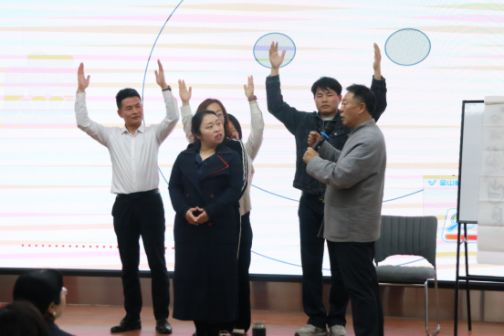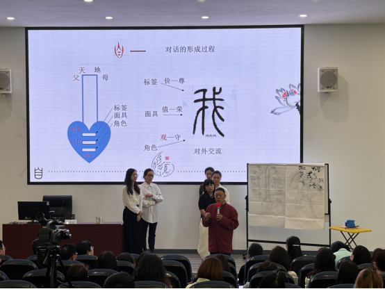 为了更生动的演绎“自”“我”“肉”之间的关系,格桑泽仁用板书图示来进行了解释,并在现场邀请了五位教师上台配合演示。通过他的讲解和老师们生动的演绎,与会师生直观的感受到了“抑郁症”“自闭症”等常见心理疾病的表现特征与应对方式,更加深刻的体会了“自我”。