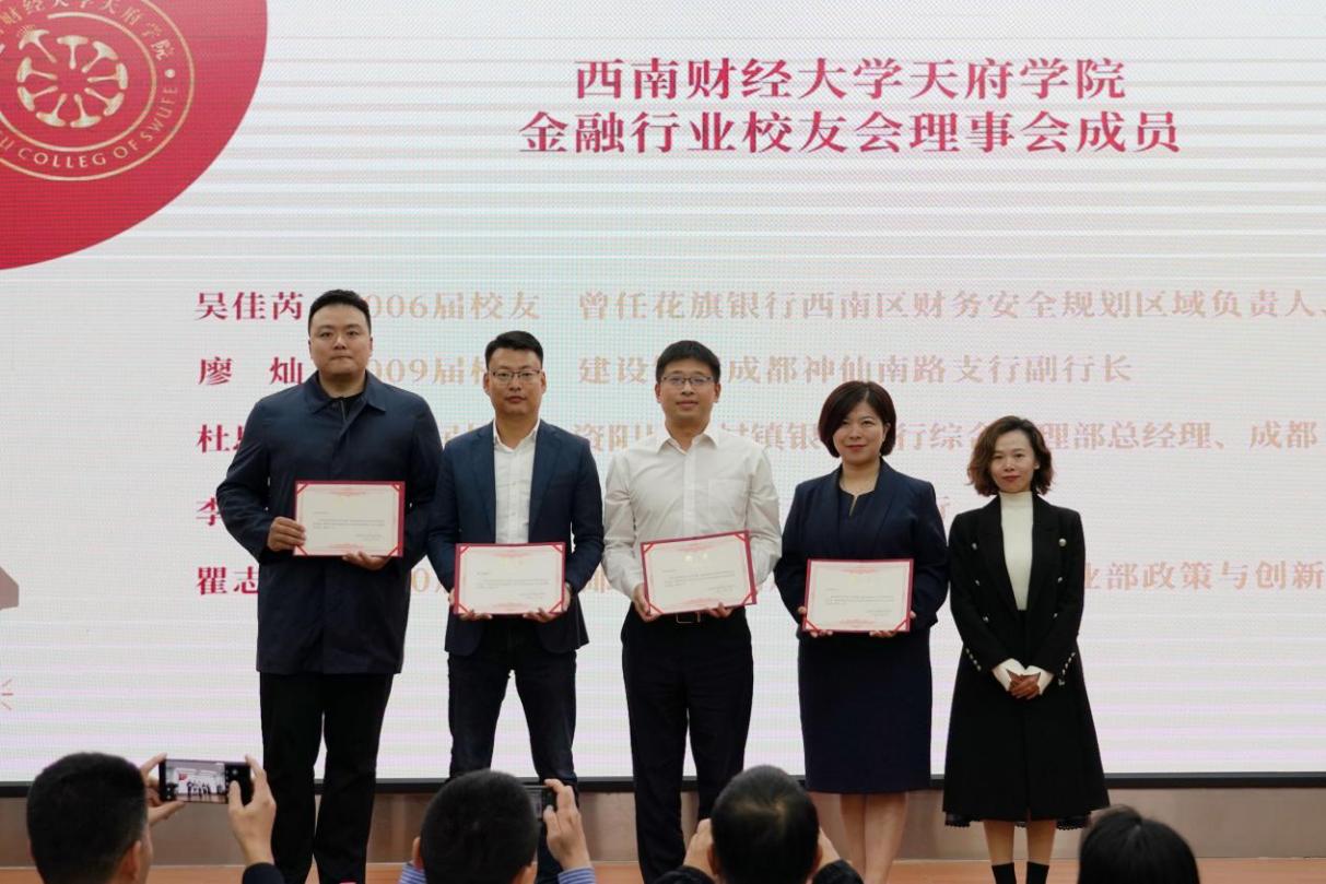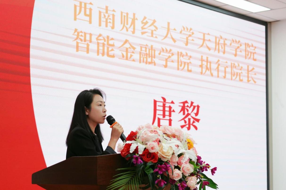 聘书颁发结束后,智能金融学院执行院长唐黎发言致辞。唐黎首先向各位校友介绍了学院的发展近况,作为全国首个以智能金融冠名的学院,学院致力于培养能提供智能化、个性化金融服务的复合型人才,在此基础上,学院与电子科技大学成都学院合作开设金融学联合学士学位创新班,并设立金融工程、国际私人银行方向金融学等特色专业。她希望各位校友能与智能金融学院共同发展,进一步深化与学院和学校在人才培养和学科建设上的合作,和学校一起培养更多符合时代需要的高素质金融人才。