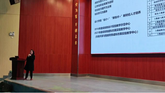 陈真子介绍了学校“以学生职业发展为目标、综合能力提升为主线、知识学习为载体”的人才培养指导思想,正是在这样的思想指导下,作为应用型高校对社会的变化和社会对人才需求的变化是很敏感的,会计学院自2015年启动了人才培养转型改革,构建了以“会计+”和“新技术+”为改革思想的新财经人才培养的新生态,构建了数智化新财经人才培养的课程体系,以省级实验教学中心和省级虚拟仿真教学中心为重要平台支撑。其中以虚拟仿真商业社会平台和升级后的数智商业综合实践平台为支撑的《财务多岗位综合实训》课程,有力支撑了财务综合实训需求,培养了学生商业社会认知、岗位认知和操作能力,也有力支撑了课程的高水平建设,助推学生培养更接近数智企业实际业务,符合财务创造企业价值,向实时会计、智能财务转变的岗位需求。