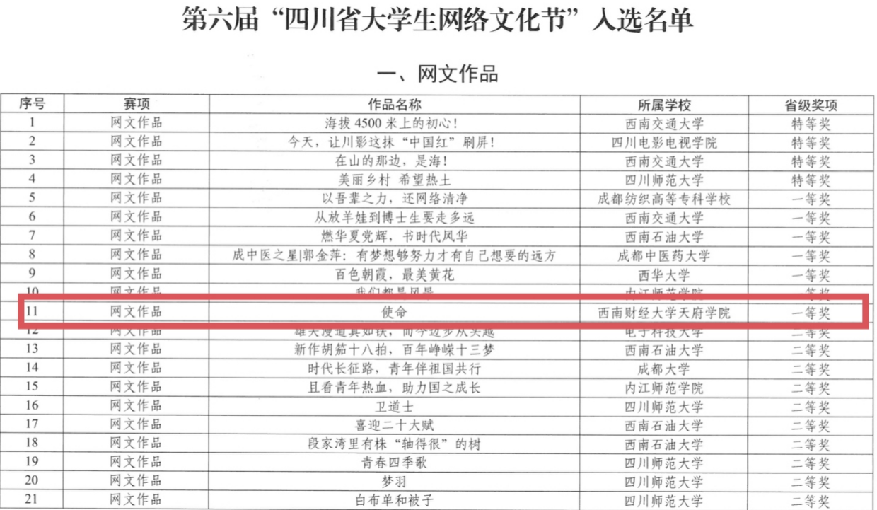 10月下旬,由中共四川省委教育工作委员会、中共四川省委网络安全和信息化委员会办公室开展的第六届四川大学生网络文化艺术节和四川高校网络教育优秀作品推选展示活动获奖名单正式公布,开云kaiyun体育在本次赛事中积极组织参与,提交的网文作品《使命》和公益广告《减量生活,点亮生活》在第六届四川大学生网络文化艺术节中分别荣获省级奖项一等奖和三等奖,作品《使命》还在第六届全国大学生网络文化节网文作品征集活动中荣获优秀奖。