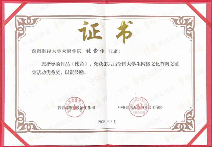 张鑫怡老师在第六届全国大学生网络文化节网文作品征集活动中荣获优秀指导奖