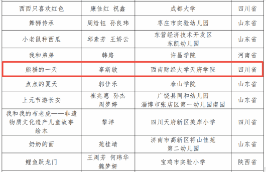 第二届沿黄九省(区)原创儿童图画书素材创意大赛由山东省、山西省、内蒙古自治区、河南省、四川省、陕西省、甘肃省、青海省、宁夏回族自治区联合主办,旨在深入贯彻落实党的二十大精神及习近平总书记关于黄河流域生态保护和高质量发展的重要指示批示精神,充分挖掘黄河文化蕴含的时代价值和育人元素,丰富教育资源。经过多轮评审,学校学生辜斯敏作品《熊猫的一天》荣获全国二等奖。