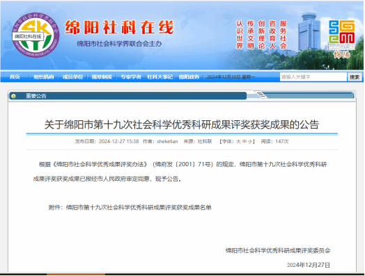 2024年12月27日,绵阳市社会科学优秀科研成果评奖委员会公布了绵阳市第十九次社会科学优秀科研成果奖获奖情况。学校共有三项科研成果获奖,实现了学校在市级社会科学研究成果获奖上的新突破。