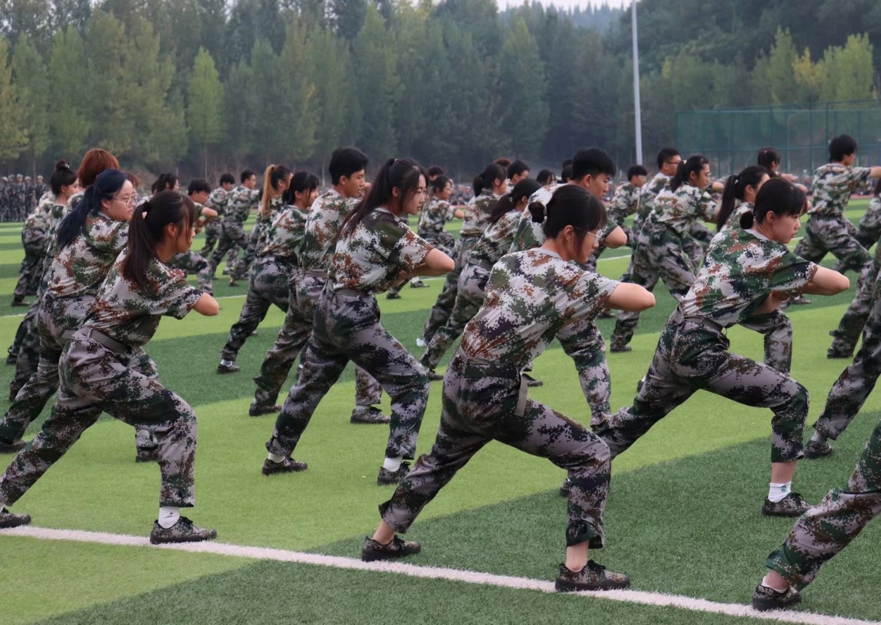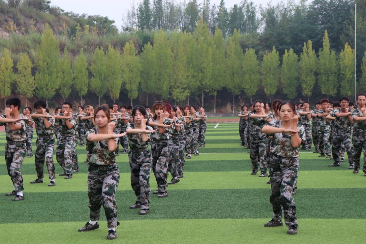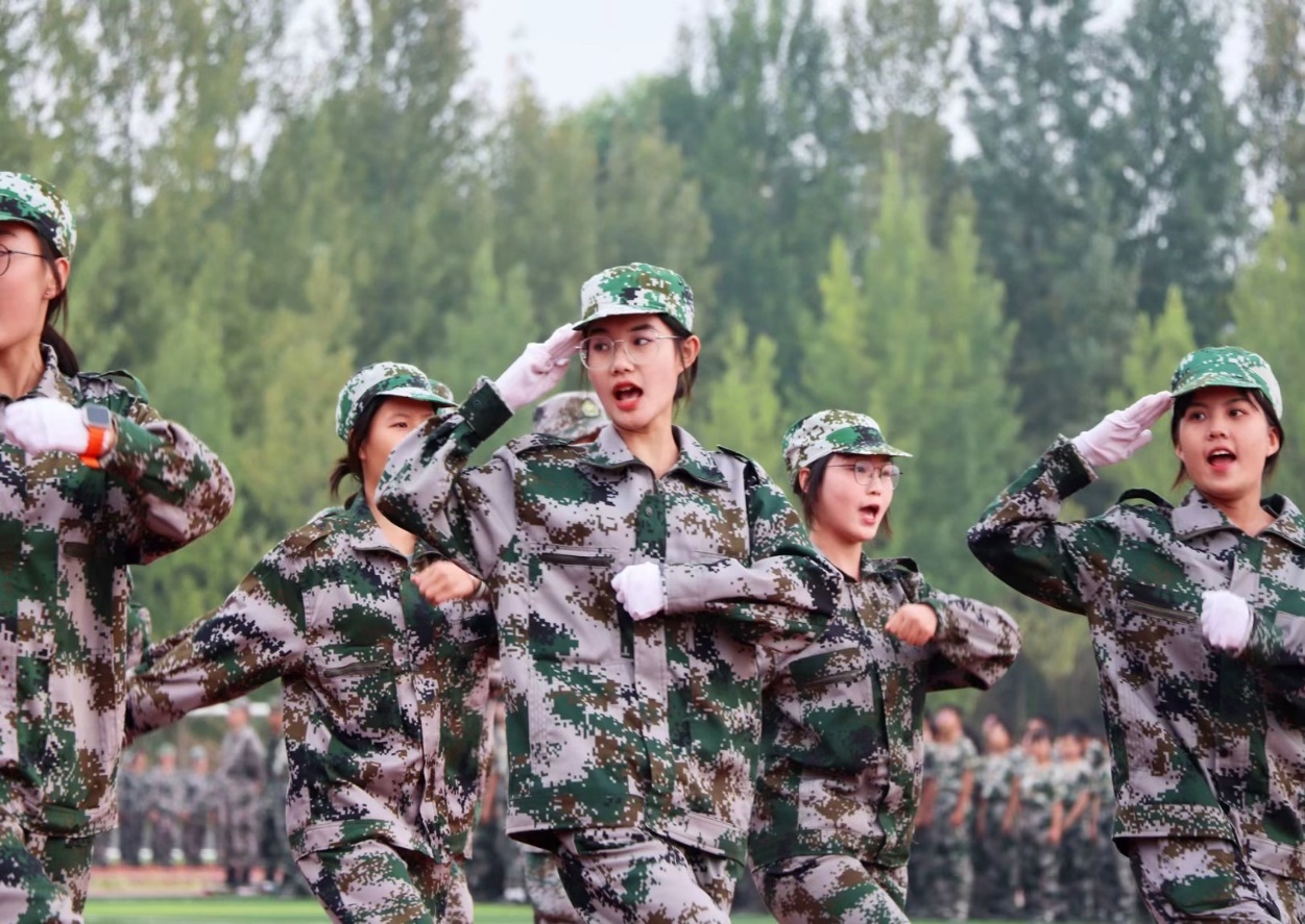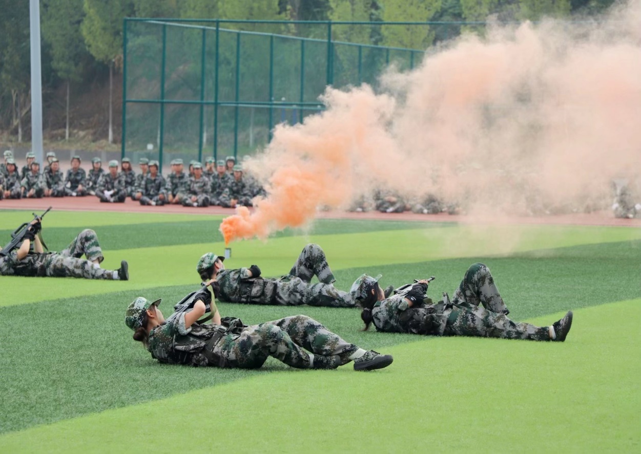 上午8时30分,伴随着气势磅礴的国歌声,大会正式开始。在铿锵的音乐声中,分列式方队依次入场,他们朝气蓬勃、斗志昂扬,喊着响亮的口号,展现了2023级新生自信的风貌,也体现了当代大学生的青春活力。汇报表演中,刚接受完军训的新生们表演了刺杀操、擒敌拳、“青春向上”舞蹈、战术格斗、强军战歌等。他们动作整齐划一,阳光下的步伐铿锵有力,舞姿活泼大方,歌声嘹亮长空,彰显积极向上的青年模样。随后全体教官和学员代表组成的战术方队入场,他们手持钢枪,听从指挥,变化队形或是在烟雾中摸索前进,打出了青年人的热血与激昂。精彩的表演赢得了在场领导、师生的热烈鼓掌。