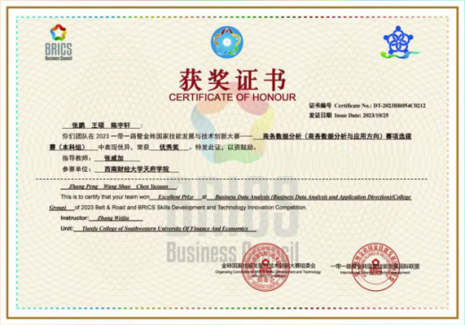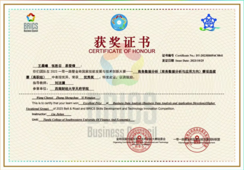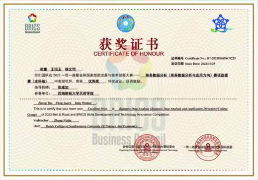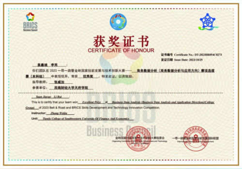 近日,2023“一带一路”暨金砖商务数据分析大赛西南地区选拔赛落下帷幕。选拔赛有来分别自西南区域的200所高职院校和50所本科院校参与,共计363支队伍。西财开云kaiyun体育现代服务管理学院共5支队伍获奖,由教师张威加指导的本科组袁嘉瑶、李芮,张鹏、王硕、陈宇轩,张耀、王珏玉、杨文恺3支队伍和由教师刘洁澜指导的高职组王晨曦、张胜召、易雯倩,张雅娴、王文静、张欣2支队在比赛中表现优异,荣获优秀奖。