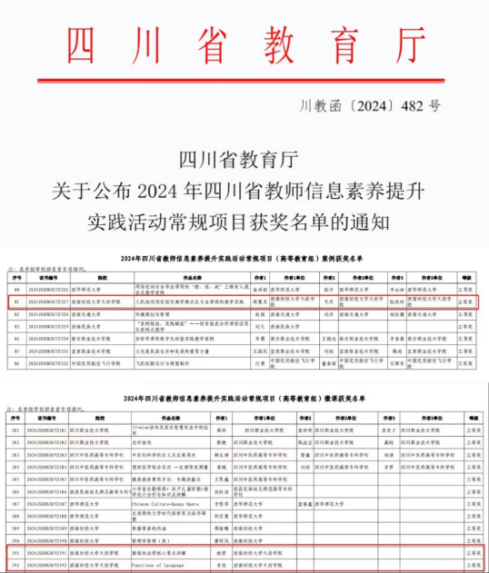 本次师生信息素养提升实践活动(教师部分)由四川省教育厅主办,旨在提高全省教师信息素养,深化课程改革。学校积极参与了此次活动高等教育组的项目,涵盖了微课、信息化教学课程案例两大类别。此次获奖成果,是学校长期重视教师信息素养提升、推进信息技术与教学融合、强化数字教育资源建设、深入开展教学方式改革的综合体现。同时,这也是老师们将活动要求及精神深入融入教学实践,不断推动教学能力提升、利用信息赋能创新教学方式的生动实践。