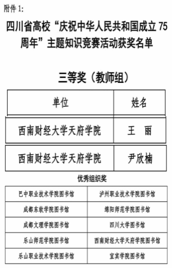 第七届“悦读新时代:四川高校阅读文化节”系列活动之“庆祝中华人民共和国成立75周年”主题知识竞赛全省共计70所高校30126名师生参赛,经初赛和复赛,学校共有14名师生获奖,谢鑫、范迎春获学生组优秀奖,尹欣楠、王丽获教工组三等奖,韩元春、武同雁、李丹、彭丹阳、叶颖静、王利文、殷兰希、周晓慧、张长江获教工组优秀奖,周晓慧获优秀指导教师奖,学校图书馆获优秀组织奖。