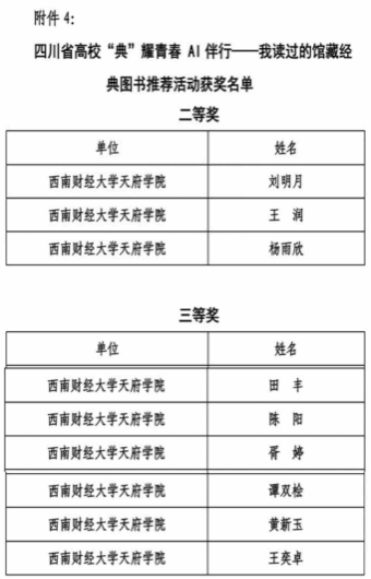 第七届“悦读新时代:四川高校阅读文化节”系列活动之四川省高校“‘典’耀青春 AI伴行——我读过的馆藏经典图书推荐”活动全省共计57所高校2134名大学生参加,经主办方组织专家评审,评选出个人一等奖2名、二等奖3名、三等奖10名、优秀奖50名,以及最佳组织奖10个、优秀指导老师38名,学校学生3人荣获二等奖,6人荣获三等奖,14人荣获优秀奖,12位老师荣获优秀指导老师奖,图书馆荣获最佳组织奖。