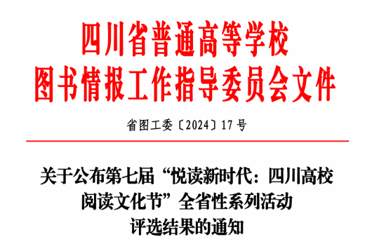 第七届“悦读新时代:四川高校阅读文化节”系列活动以“阅见美好 智绘未来”为主题,用数智技术赋能全民阅读,凝聚四川高校师生奋进新时代的强大精神力量,学校图书馆积极响应,组织师生参赛,荣获多项佳绩,彰显天府学子风采,以数智化引领书香校园建设,为教育强省、文化强省建设贡献高校图书馆力量。
