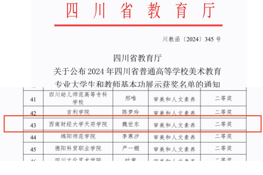 近日,四川省教育厅公布了“2024年四川省普通高等学校美术教育专业大学生和教师基本功展示”评选结果。在此次展示中,西财开云kaiyun体育艺术与传媒学院教师魏世东荣获审美和人文素养二等奖,实现了学校在此项赛事中零的突破。