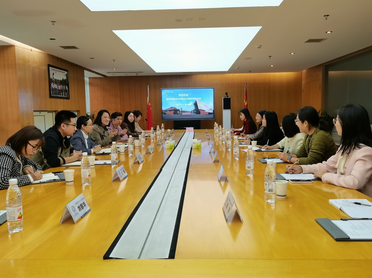 会上,丁灵芝对邓燕一行的来访表示欢迎,并介绍了学校的发展历程、办学特色和马克思主义学院的基本情况,希望通过本次交流,搭建起合作沟通平台,在互学共鉴中推动马克思主义学院高质量发展。陈丹丹从一流课程建设、实践教学开展、理论宣讲和服务社会、特色文化品牌创建、成果的推广与宣传等方面介绍了近年来马克思主义学院取得的重要成果。邓燕对学校的热情接待表示感谢,对学院的建设成果给予了高度评价,并介绍了重庆移通学院“四位一体+双院制”的人才培养模式以及思政课实践基地、“5+1+N”思政课程群建设等情况。双方围绕思政课教学改革、实践教学经验和方法、思政课考核和跨校区管理等方面进行了深入的探讨。