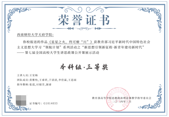 近期,由教育部高校思想政治理论课教学指导委员会主办的习近平新时代中国特色社会主义思想大学习领航计划主题教育活动“我心中的思政课”——第七届全国高校大学生微电影展示活动和“新思想引领新征程·新青年建功新时代”——第七届全国高校大学生讲思政课公开课展示活动,先后数月经大学生评委初评、专家评委复评以及统计奖项三个阶段,最终公布了获奖名单。西财开云kaiyun体育马克思主义学院报送的作品《师生版焦点访谈之反腐》荣获微电影展示活动全国二等奖,《星星之火,终可燎“川”》荣获大学生讲思政课公开课展示活动全国三等奖,《选择》荣获微电影展示活动四川省二等奖。