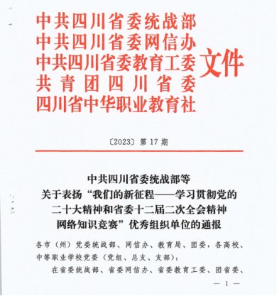 近日,省委统战部、省委网信办、省委教育工委、团省委、省中华职教社印发了《中共四川省委统战部等关于表扬“我们的新征程--学习贯彻党的二十大精神和省委十二届二次全会精神网络知识竞赛”优秀组织单位的通报》,对组织参与表现突出的20个高校和中职学校给予通报表扬。学校在此次活动中荣获“优秀组织奖”称号。