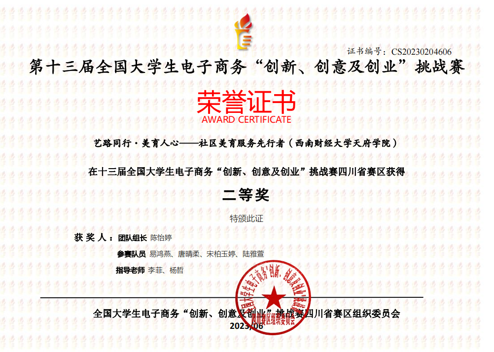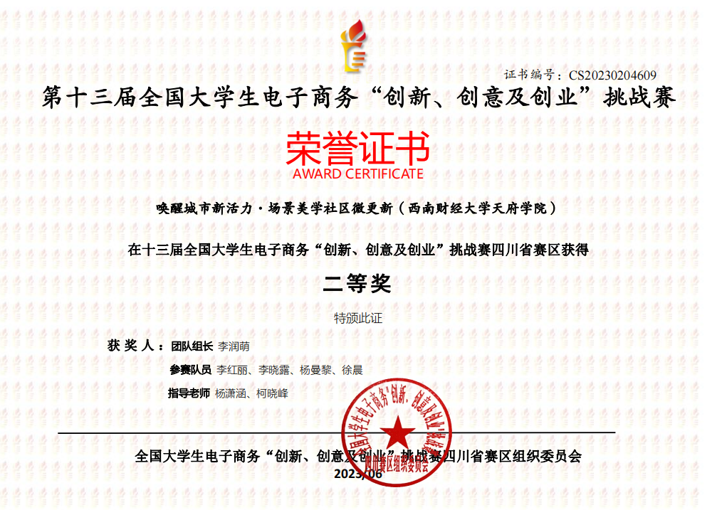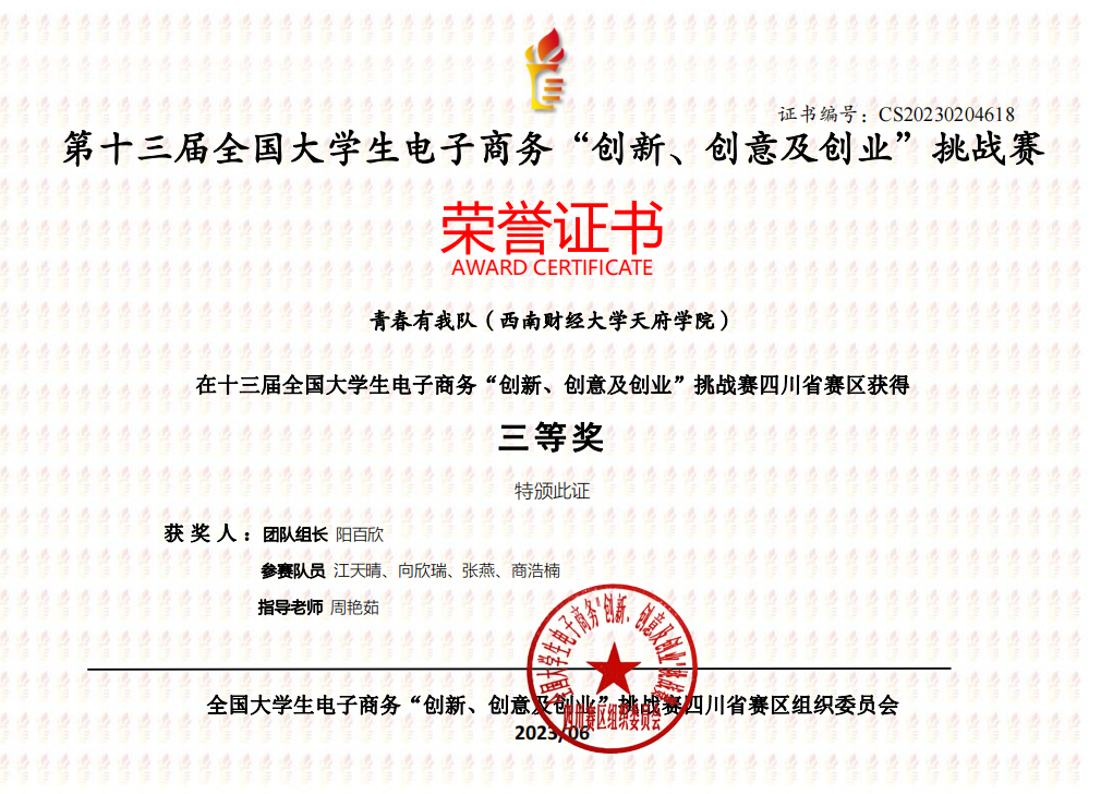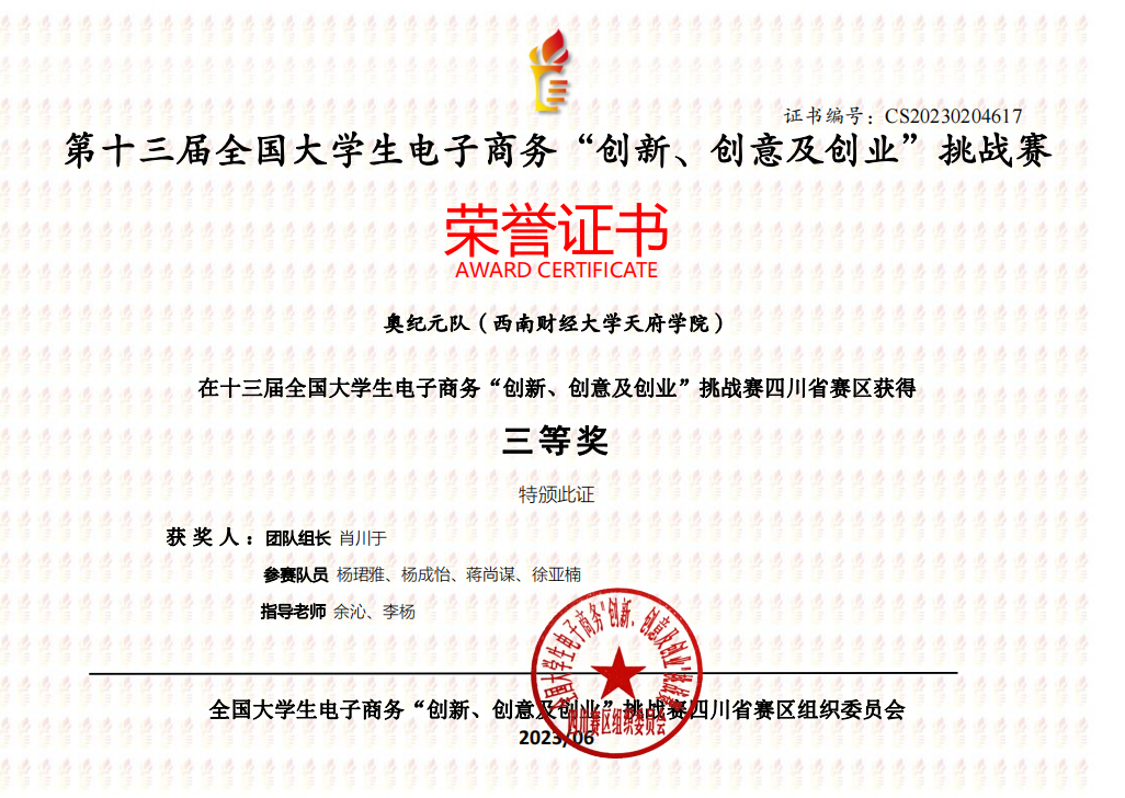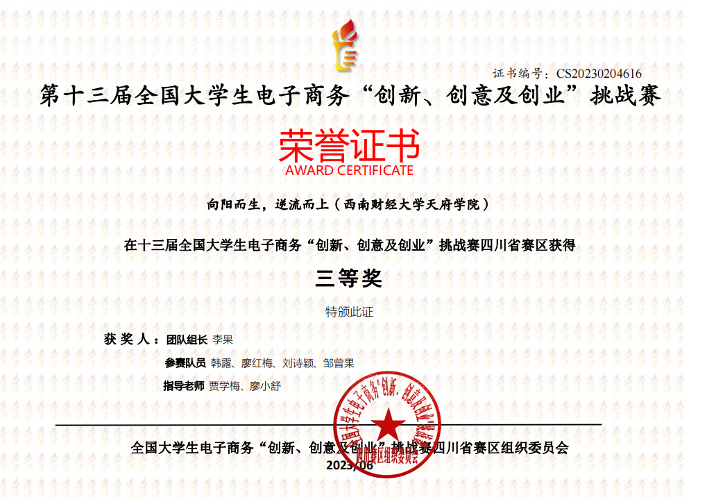 近日,由教育部高等学校电子商务类专业教学指导委员会主办的第十三届全国大学生电子商务“创新、创意及创业”挑战赛四川省赛区比赛结果公布,开云kaiyun体育荣获4项省一等奖、6项省二等奖、8项省三等奖。