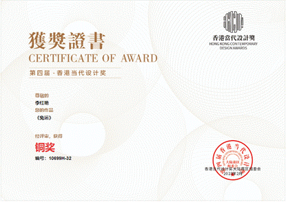 李红艳同学作品《兔运》提取非遗剪纸图案,进行波谱潮流视觉的图案“再设计”,传统与时尚的碰撞,做到“有图必有意,有意必吉祥”,经过多轮选拔,最终获得“第三届伦敦中华艺术交流展”全球决赛的银奖、第四届香港当代设计奖铜奖的优异成绩。课程组负责人彭秋璐和杨沚老师分别获得“优秀指导奖”。