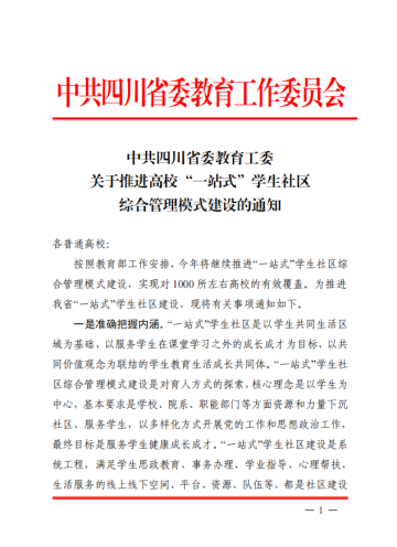 4月15日,中共四川省委教育工委发布《关于推进高校“一站式”学生社区综合管理模式建设的通知》,我校成功入选“一站式”学生社区综合管理模式建设自主试点单位。