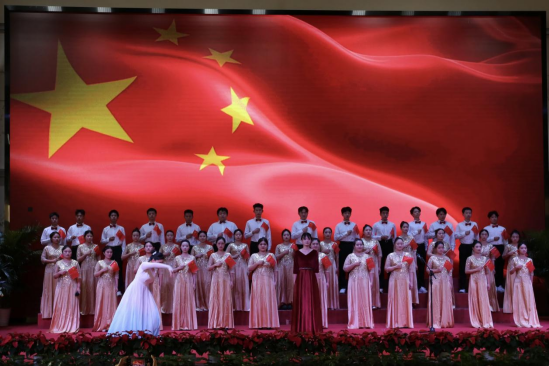 学校大学生合唱团带来了歌曲《歌唱祖国》,用嘹亮的歌声和饱满的热情为新中国成立75周年献礼,激昂的旋律表达对祖国繁荣昌盛的美好祝愿,也展现了天府人与时代同行、与祖国共进的奋斗姿态。