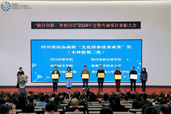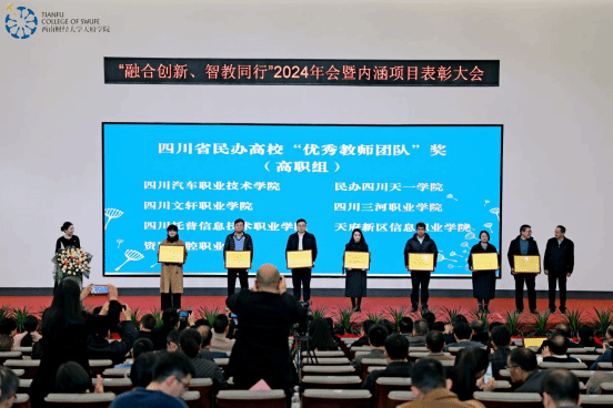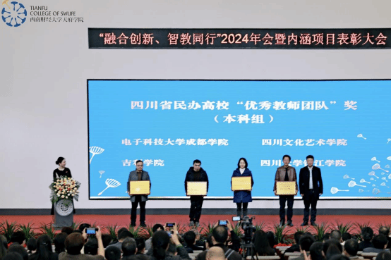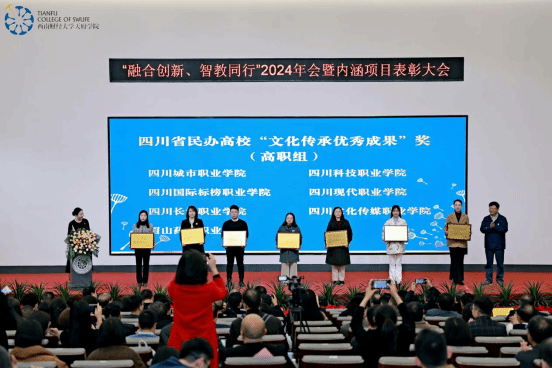 四川工商学院校长、省民办教育协会研究中心主任胡雁介绍了《四川省民办高校教育教学内涵建设项目》评审情况,就评审背景、评审过程和方法、未来发展愿景等进行了说明。随后大会进行内涵项目颁奖仪式,对四川省民办高校文化传承优秀成果奖和优秀教师团队奖进行表彰,与会领导和嘉宾为获奖单位代表进行颁奖。