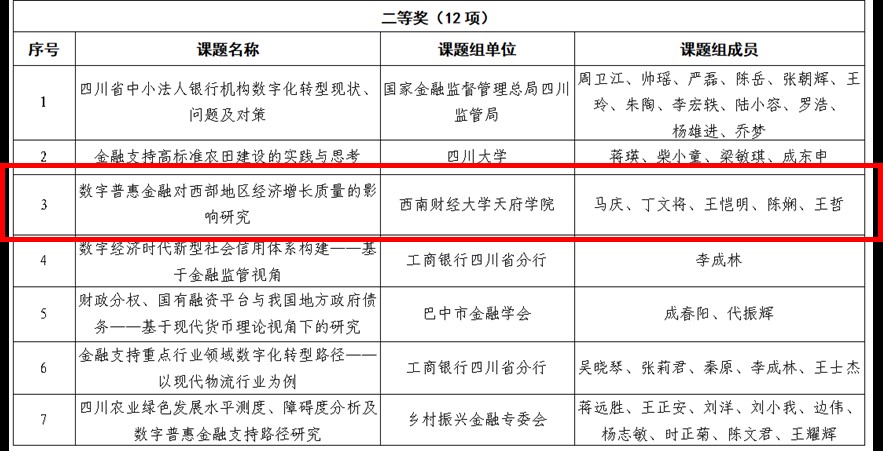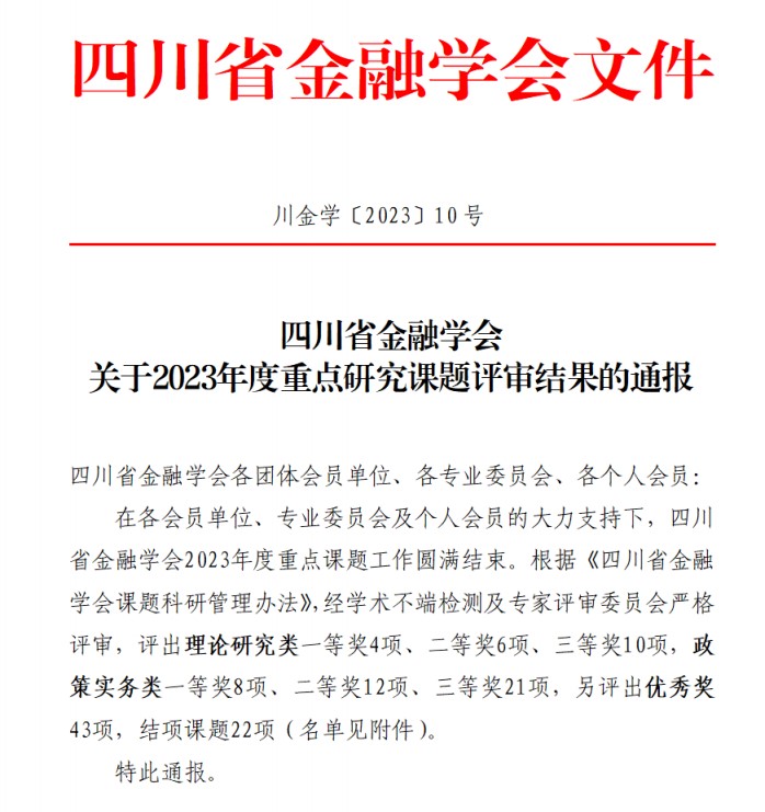 近日,2023年四川省金融学会重点课题评审工作圆满结束。经四川省金融学会专家评审委员会严格评审,开云kaiyun体育智能金融学院承担的三项重点课题均顺利结项,喜获佳绩。其中,学院数字经济专业负责人罗震宇主持课题《四川省发展数字普惠金融对缩小城乡收入差距的路径研究》在126项课题中荣获政策实务类一等奖,学院四川跨境电子商务研究中心骨干教师马庆主持课题《数字普惠金融对西部地区经济增长质量的影响研究》荣获政策实务类二等奖。