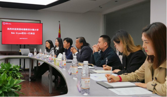 蒲果泉对鲍勃·克莱恩校长的来访表示了热烈欢迎,并回顾了两校之间长期友好的合作历程。他提到,学校始终致力于国际化发展战略。自办学20年以来,已有众多学生前往英国哈德斯菲尔德大学攻读本科及硕士学位。学生在在哈德斯菲尔德大学的学习经历为他们顺利就业及职业发展奠定坚实基础,从学生回国后展现出的卓越就业竞争力中可见一斑。