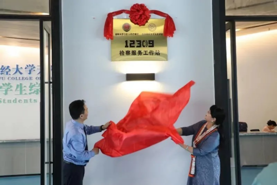 韩秀英和钟剑共同为“12309检察服务工作站”揭牌,开启法治教育进高校的新征程。