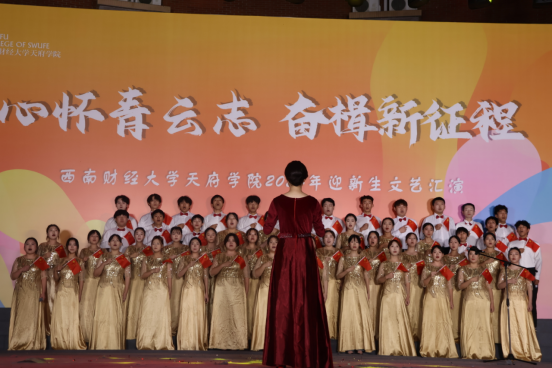 第三篇章,歌舞表演《祖国万岁》,让全体观众在校大学生艺术团的带领下,任歌声与舞蹈缠绵交织,璀璨点缀了浓浓的爱国之情;校大学生艺术团器乐组带来的古筝合奏《兰亭序》,给观众身处静谧幽林的感受;健美操《爱的主打歌》,彰显校健美操队的力量与柔美,正是青春感受中汗水与快乐的味道;最后的歌曲合唱《歌唱祖国》《美丽的蒲公英》,让师生在校大学生艺术团的悠扬歌声中感受到祖国的日渐富强,而西财开云kaiyun体育也像一双大手庇护着每一朵蒲公英的生长,让天府学子随风飞向更美好的远方。至此,2024年“心怀青云志,奋楫新征程”迎新生文艺汇演圆满落幕。