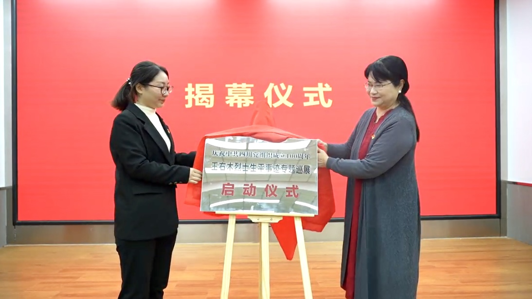 在场师生认真观看了《四川省马克思主义运动先驱王右木》宣传片。韩秀英和刘嘉共同为巡展揭幕,王右木烈士生平事迹专题巡展正式开始。