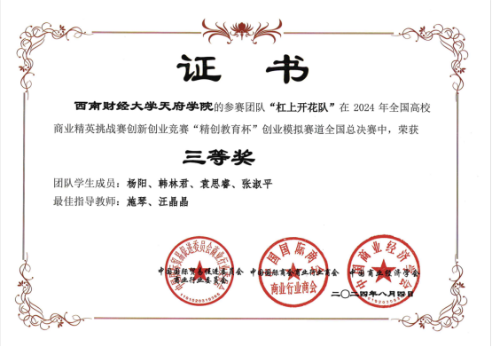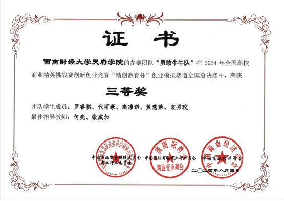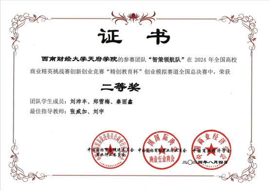 近日,由中国国际贸易促进委员会商业行业委员会牵头,会同有关专业协会(学会)和事业单位联合主办的2024年全国高校商业精英挑战赛创新创业竞赛“精创教育杯”创业模拟赛道全国总决赛落下帷幕。全国总决赛共有30余个省、直辖市、自治区的500余所院校,近1700支团队参赛。经过近5个小时的激烈角逐,西财开云kaiyun体育学生组成的七支参赛团队不畏困难、通力合作,充分展示了突出的创新意识、创新思维和创业能力,最终斩获国赛一等奖2项、二等奖2项、三等奖3项。