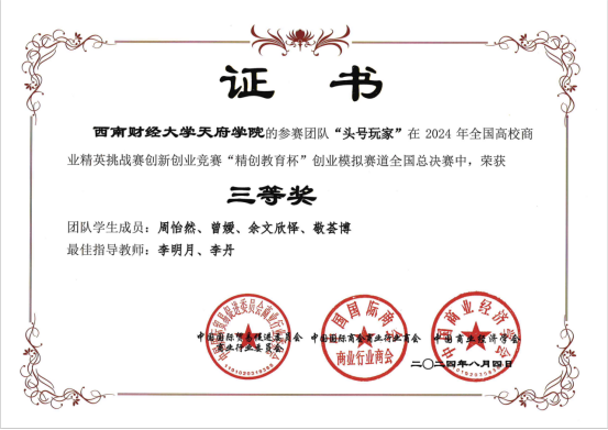 本届“精创教育杯”创新创业竞赛分为三个阶段,分别是知识赛、区域赛和全国总决赛。在知识赛阶段,采取个人赛的形式,主要考核学生的相关专业知识。在区域赛阶段,学生以团队为单位参赛,采用线上创业模拟软件操作的方式进行。学校高度重视比赛的组织和选拔,在学院领导大力支持和指导教师悉心指导下,七支队伍成功晋级全国总决赛。全国总决赛在创新创业实战模拟竞赛对抗平台采取线上竞赛的方式。参赛队员沉着冷静,认真备赛,不断提高对模拟结果和比赛策略的分析能力,从熟悉平台规则、分析软件模拟结果到总结比赛策略全力以赴,最终获得全国总决赛一、二等奖和三等奖的好成绩,充分展示了天府学子扎实的专业素养与创新能力。