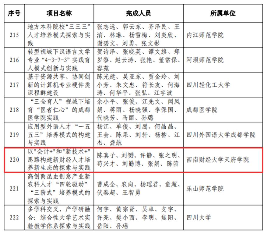 4月11日,《四川省人民政府关于公布2021年四川省教学成果奖的通知》(川府函〔2022〕85号)正式发布。本次评选在基础教育、职业教育、高等教育3个领域独立设置奖项,学校教学成果《以“会计+”和“新技术+”思路构建新财经人才培养新生态的探索与实践》荣获高等教育教学成果二等奖。