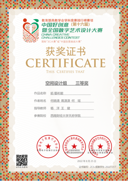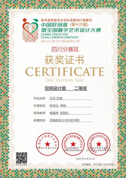 近日,由全国高等院校计算机基础教育研究会、中国电子视像行业协会主办的“第16届中国好创意暨全国数字艺术设计大赛”落下帷幕,建筑与工程学院学子在本次大赛中首创佳绩,其中王健、杨洋老师指导的作品获得国家级一等奖、三等奖各一项,杨越淋、郑丽红老师指导的作品获得四川省二等奖一项。
