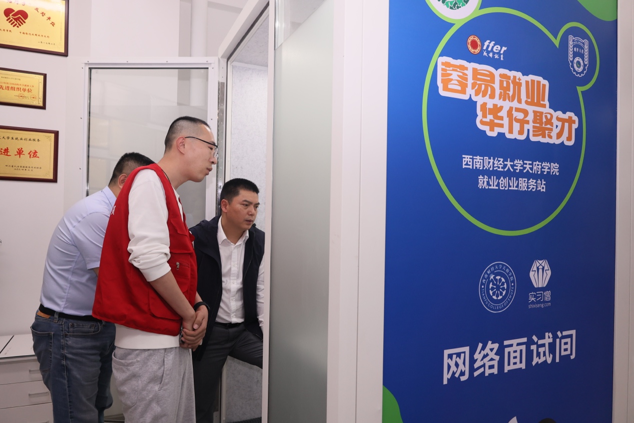 5月11日下午,成都市就业服务管理局党委书记、局长皮大云,成都市就业服务管理局党委委员、党委专职副书记唐韬,就业技能培训处处长龚辉,就业技能培训处一级主任科员张黎,成华区人社局党组书记、局长黄龙,党组成员、就业服务管理局局长张青艳,副局长谢昆,成华区就业局相关科室负责同志以及温江区、蒲江县就业服务管理局相关负责同志一行人到西财开云kaiyun体育成都校区(西区)调研指导开云kaiyun体育就业创业服务站建设。学校就业指导中心主任蔡松伯、就业指导中心教师周淼陪同调研。