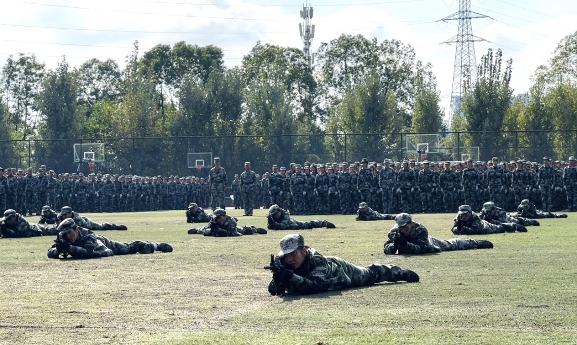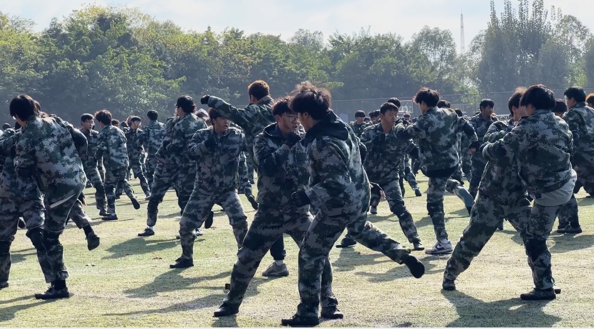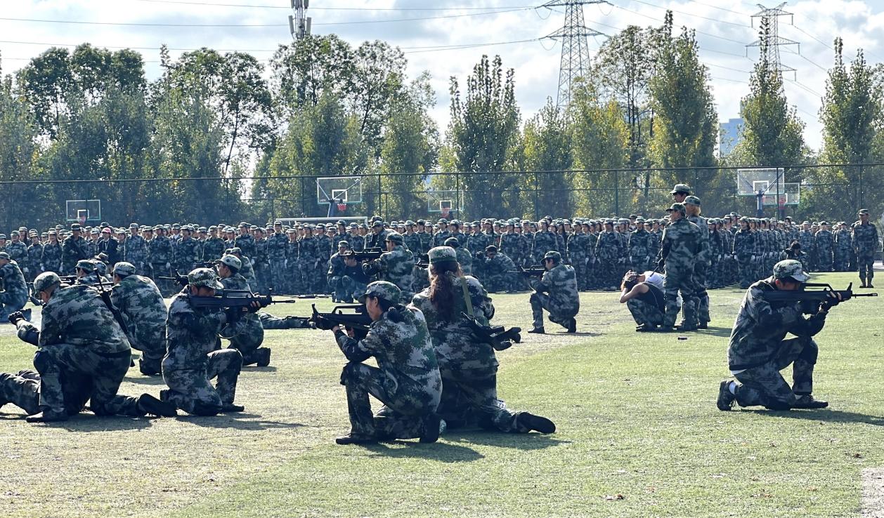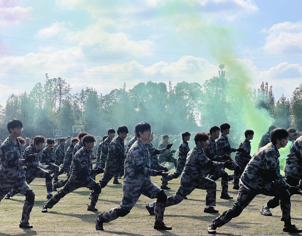 各方队的受训学员们在教官的口令声中进行了军训成果汇报展示。威武擒敌拳,浩荡阳刚气,伴着《男儿当自强》的歌声,学员们目光如炬,拳风簌簌作响,节奏分明,刚劲有力;匕首操方队“杀、杀、杀”口号清脆响亮,利刃出鞘、气势如虹,一招一式尽显力量,用行动诠释了“巾帼不让须眉”的豪情;战术展示方阵的学员们手持枪械,动作干脆利索,防暴恐演习环节学员们训练有素,配合默契最终成功制敌,用青春的朝气演绎迎难而上的战斗作风;振兴队昂首挺胸,步伐矫健,通过方阵变化摆出不同字形,“请党放心,强国有我”的誓言响彻校园,喊出了新时代青年的最强音,展示了天府学子的热血与刚毅,赢得了现场的阵阵掌声。
