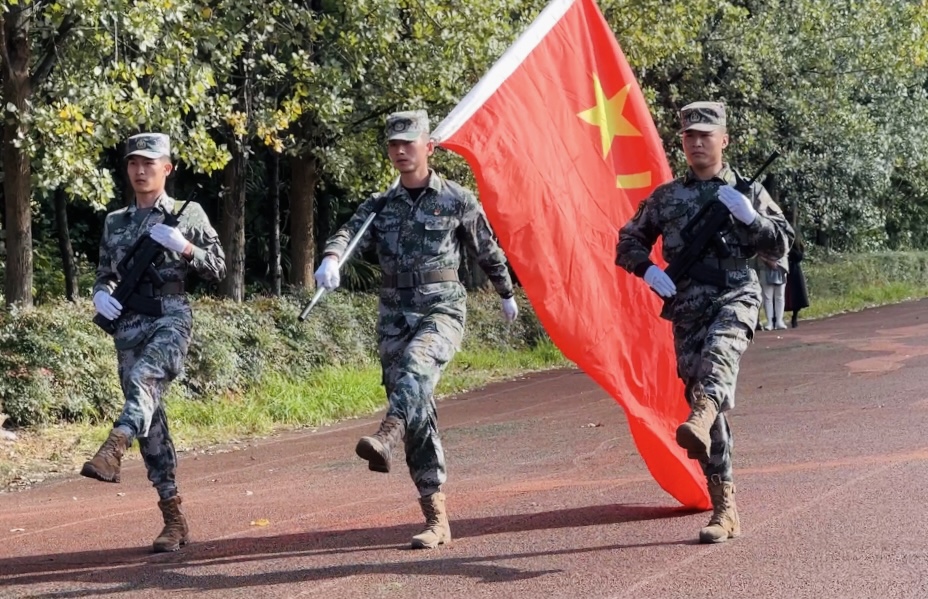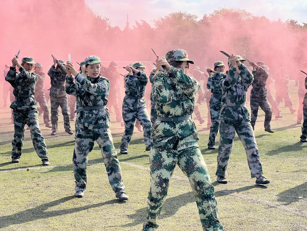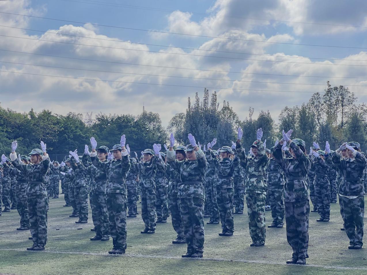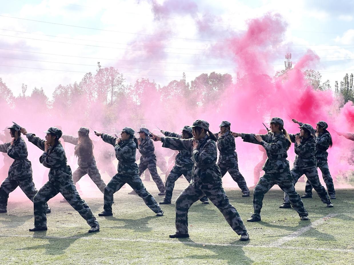 各方队的受训学员们在教官的口令声中进行了军训成果汇报展示。威武擒敌拳,浩荡阳刚气,伴着《男儿当自强》的歌声,学员们目光如炬,拳风簌簌作响,节奏分明,刚劲有力;匕首操方队“杀、杀、杀”口号清脆响亮,利刃出鞘、气势如虹,一招一式尽显力量,用行动诠释了“巾帼不让须眉”的豪情;战术展示方阵的学员们手持枪械,动作干脆利索,防暴恐演习环节学员们训练有素,配合默契最终成功制敌,用青春的朝气演绎迎难而上的战斗作风;振兴队昂首挺胸,步伐矫健,通过方阵变化摆出不同字形,“请党放心,强国有我”的誓言响彻校园,喊出了新时代青年的最强音,展示了天府学子的热血与刚毅,赢得了现场的阵阵掌声。