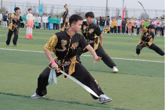 随后,建筑与工程学院学子为大家带来了刚劲有力的拳术、棍术、刺杀表演;校健美操校队扬起笑容,舞起花球,一场精彩纷呈的《Lose control》表演,赢得了观众们的阵阵掌声;文化与教育学院的师生动作整齐划一,他们带来的《武魂传奇》动作干净利落,让现场欢呼不断。