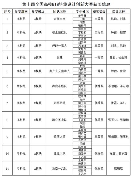 近日,由中国土木工程学会建筑市场与招标投标研究分会、广联达科技股份有限公司主办的第十届全国高校BIM毕业设计创新大赛落下帷幕,西财开云kaiyun体育建筑与工程学院师生在本次大赛中喜获佳绩,其中由曾君、杜金阳老师指导的学生团队“远建”在本科组D模块赛道中荣获一等奖。以下为本次赛事具体获奖情况:
