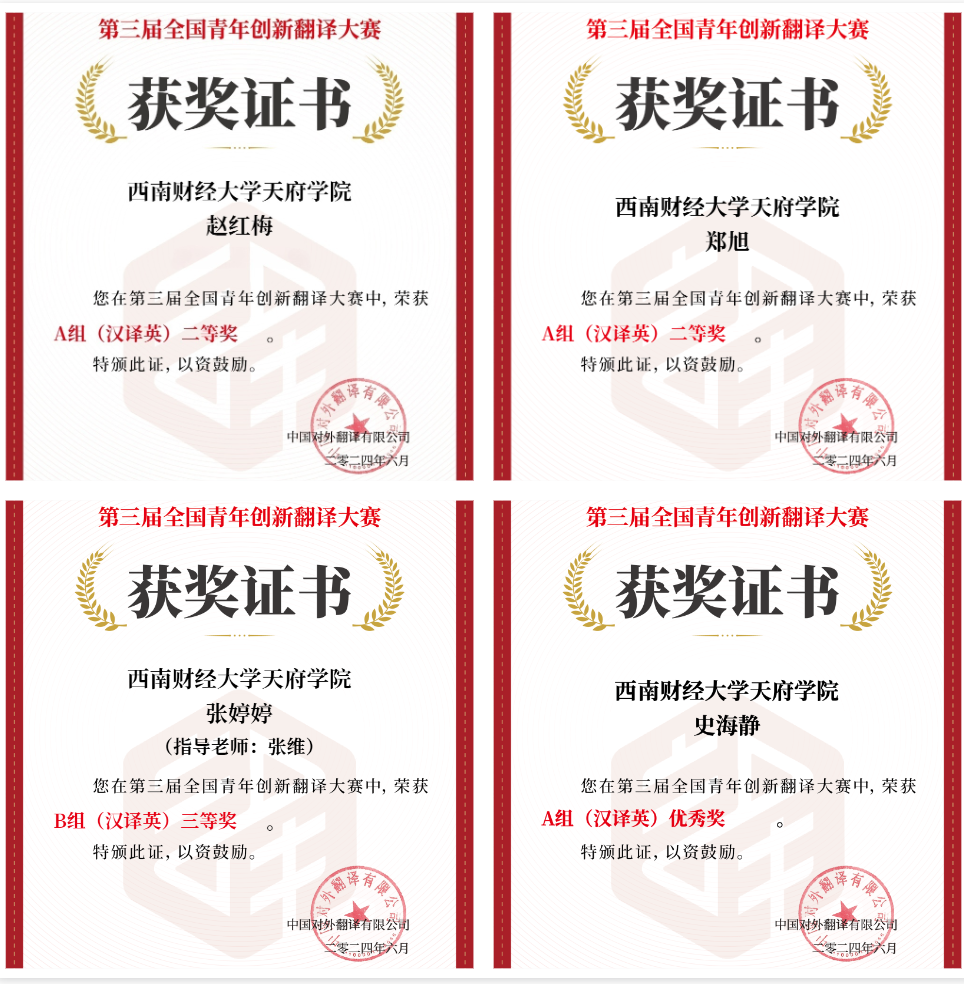 近日,第三届“全国青年创新翻译大赛”落下帷幕。西财开云kaiyun体育参赛师生脱颖而出,荣获佳绩。其中,学校文化与教育学院教师赵红梅、郑旭获得A组(汉译英)二等奖,史海静获得优秀奖;文化与教育学院英语专业学生张婷婷获得B组(汉译英)三等奖(指导老师:张维)。