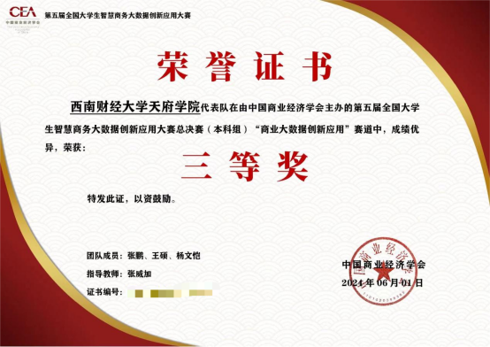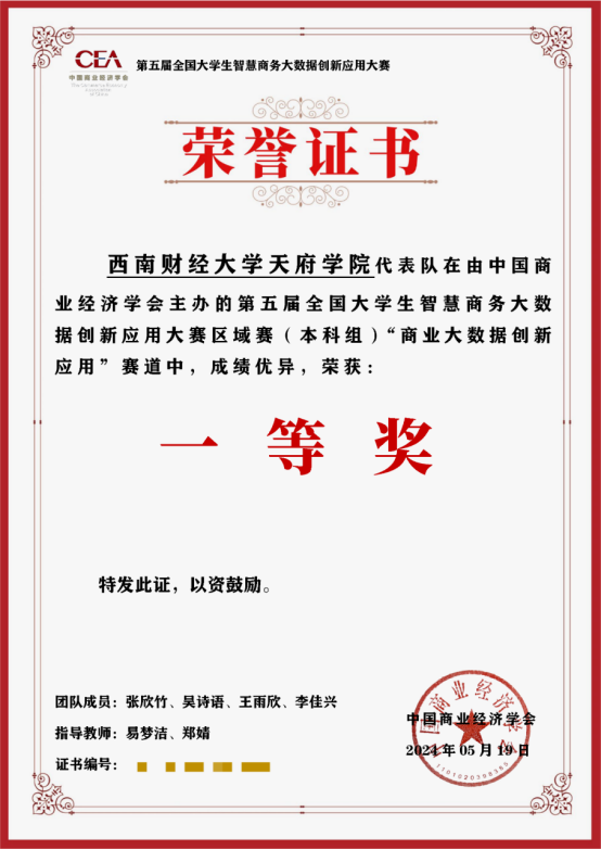 同时,由现代管理学院教师易梦洁、郑婧的指导下,来自大数据管理与应用专业的张欣竹、吴诗语、王雨欣、李佳兴、张鹏、杨文恺、王硕七位同学,在“商业大数据创新应用”赛道也展现出了优秀的团队协作和专业素质能力并斩获区域赛一、三等奖和全国总决赛二、三等奖。