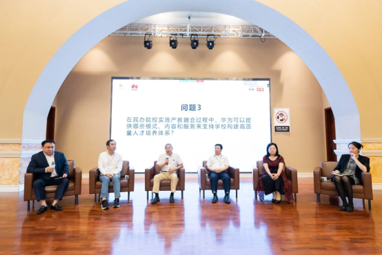 会上,泉州信息工程学院校长朱林生,南宁学院校长李栋学,广州华商学院党委书记陈玉欢,中国民办教育协会高等教育专业委员会副秘书长王位,浙江华为ICT教育研究院院长谭方等以圆桌的方式,探讨行业协会、院校、企业携手共同实现产教融合的最佳实践路径。