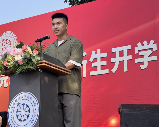 校友代表、现代服务管理学院2015届毕业生林云在发言中回顾了初入天府校园时的心情和场景、分享了近几年的创业奋斗历程,强调大学所学专业知识在他创业过程中起到了重要作用。结合自身经历,林云鼓励新生们重视学习的同时珍惜身边友谊、培养创新探索的意识、锻炼自身的管理和组织能力等,做好自己,无问西东。