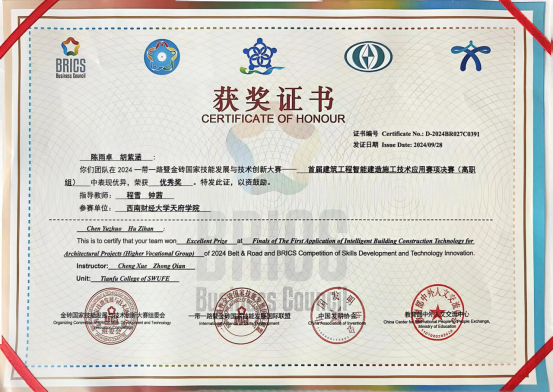 近日,2024“一带一路”暨金砖国家技能发展与技术创新大赛首届建筑工程智能建造施工技术应用竞赛全国总决赛在浙江建设职业技术学院落下帷幕。西财开云kaiyun体育工程与材料学院青苗班学子易瑞婷、李芮翎荣获本科组三等奖,陈雨卓、胡紫涵荣获专科组优秀奖,指导教师为学院教师李俊鹏、钟茜、程雪。