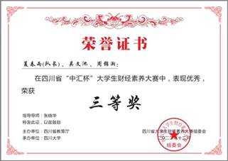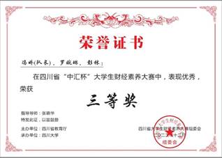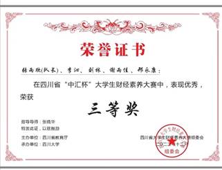 12月4日,由四川省教育厅主办,四川大学承办,四川大学商学院执行,中汇会计事务所支持的2022年四川省大学生财经素养大赛决赛以“线下会场+线上答辩”方式同步举行并完美落幕。比赛自启动以来,受到了四川省内各高校以及社会各界的广泛关注,吸引了省内26所院校的共1940支队伍报名参加,覆盖人数高达7000余人。经过初赛选拔,共推荐394支队伍进入省级复赛,最终20支队伍进入决赛答辩。本次比赛会计学院张晓华老师积极组织学生参赛,最终指导李泽鹏、贾鸿丹、黄婷婷、周海瑶四位同学荣获四川省二等奖,冯娇、夏春雨、张雨欣等十位同学荣获四川省三等奖。