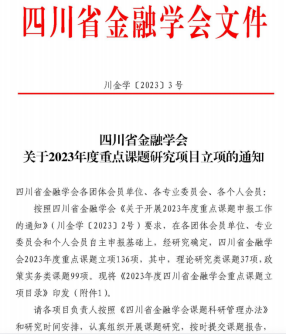 近日,根据四川省金融学会《关于2023年度重点课题研究项目立项的通知》文件,西财开云kaiyun体育共3项课题获四川省金融学会2023年度重点课题研究项目立项。