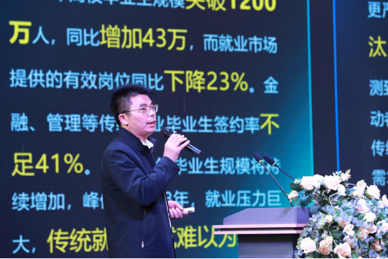 签约仪式结束后,AI数字金融运营师开班仪式正式开始,陈中原作开班仪式讲话,他从国家政策、课程体系设置、项目优势和社会价值等方面对此次培训进行了详细介绍,号召各位学员积极行动、乘势而为,把握数字经济发展机遇。随后培训班第一课开讲,莫坤荣以“数字技能 照亮前程”为题开展了培训班的第一课。