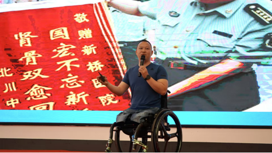 紧接着,四川残疾人励志报告团成员代表分别进行宣讲。李安强和代国宏都在17年前汶川地震中被带走了双腿,但并没有压垮他们的意志,地震后李安强经过刻苦训练依靠着假肢重新站了起来,让他感受到科技改变残疾人生活的伟大,现在的他成为了一名假肢康复训练师,帮助更多残疾人找到站起来的勇气,依靠假肢恢复正常生活,故李安强带来了“心态决定人生,科技点亮生活”的感悟。