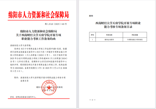 绵阳市公共实训和技能评价指导中心组织专业评审团队对学校的申请进行了严谨细致的评审。经过全面评估,评审团队认为学校具备开展健身运动指导专项职业能力考核工作的各项条件,最终批准其申请。现可以面向校内开展职业技能等级认证工作,有效期为3年。通过健身运动指导考核并合格的学生,将获得具有权威性和公信力的专项职业能力证书,该证书将成为他们在健身运动指导领域就业、创业的重要敲门砖。